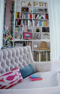 Love the white tufted sofa , the fish cushion and the gilded Capri sign